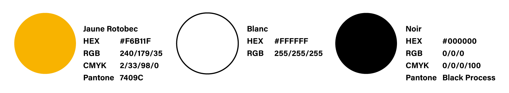 Le jaune Rotobec apporte énergie et visibilité à nos communications, tandis que le noir ancre la marque avec force et autorité. Utilisez le blanc pour créer de l’espace, mettre en valeur les éléments clés et assurer un contraste marqué dans toutes les applications.